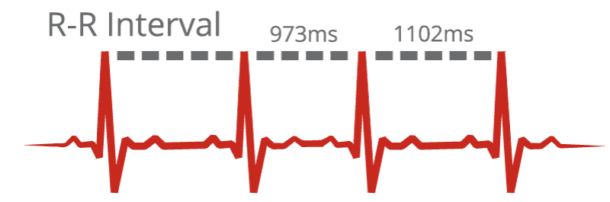The image shows an electrocardiograph reading of heart rate. Each spike in the reading represents a heart beat. This shows a time difference in between each heart beat (973ms in one vs 1102ms in the next). Image from: https://elitehrv.com/what-is-heart-rate-variability
