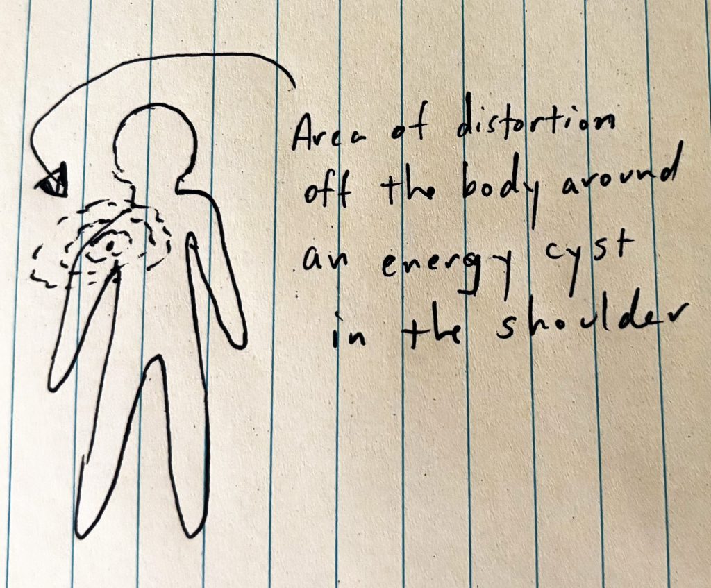 They went on to share that they were unhappy in their relationship. For many years, they had been adjusting their lifestyle to try to minimize the impact of their partner’s drinking habits.  The strain on their relationship had been steadily increasing.  They now found themselves instinctively hiding when their partner came home to avoid conflict.  As they shared this, the energy cyst had a felt sense of releasing and softening.  Verbally sharing this was important and empowering for the client.  They went on to make several major life changes in the coming months, including leaving their relationship.  With these changes, their health and energy levels began to improve.