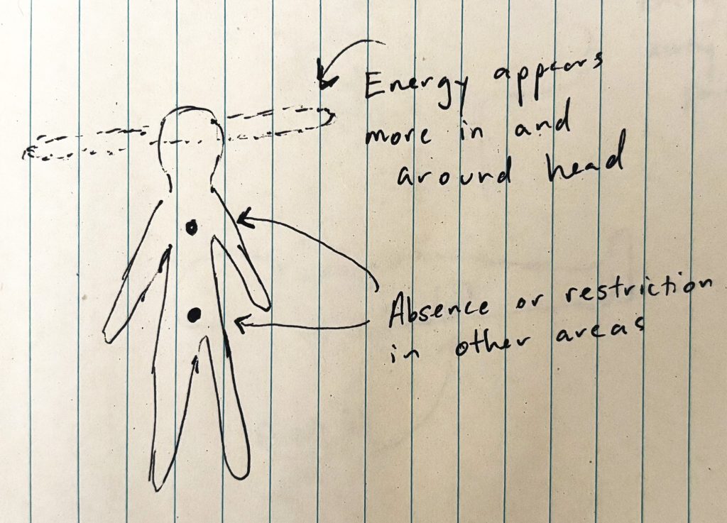 A client scheduled an Energy Meditation session with the intention of “settling their mind.” We had worked together before, and on this particular day they came in with more energy outside their body than usual. The energy also felt “cluttered.” We began with a short breathing exercise, and then moved to inhabiting the head. They were able to do this quite readily, and almost instantly the energy around their head softened and appeared more inside their head. They reported feeling a sense of calm.
